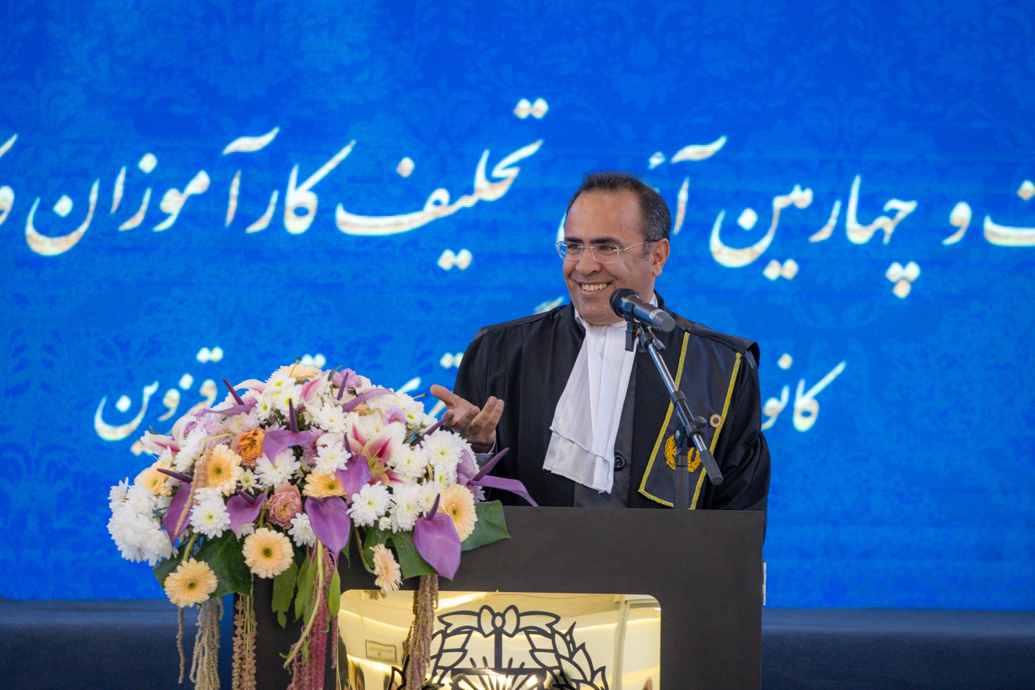 وی ضمن تبریک به کارآموزان و خانوادههای آنان، گفت: «اختبار به پایان رسید، اما دانش حقوق هیچگاه پایانپذیر نیست. امروز با ادای سوگند، شما فصل تازهای از زندگی حرفهای خود را آغاز میکنید و باید همزمان فصلی نو از دانش حقوقی را نیز بگشایید؛ دانشی که پایانی برای آن متصور نیست و پیوسته نیازمند تلاش و مطالعه است.»