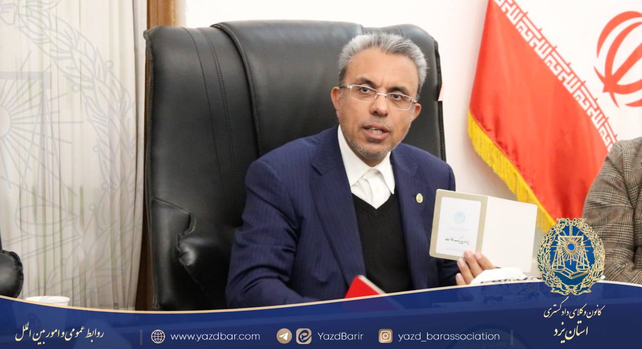 به گزارش روابط عمومی اتحادیه سراسری کانون‌های وکلای دادگستری ایران به نقل از کانون وکلای دادگستری استان یزد، در این نشست، رئیس کانون وکلای دادگستری استان یزد با اشاره به جایگاه و کارکردهای نهاد وکالت در نظام حقوقی کشور، نقش وکلا در صیانت از حقوق عمومی، تحقق عدالت و تضمین دادرسی منصفانه را تشریح کرد.